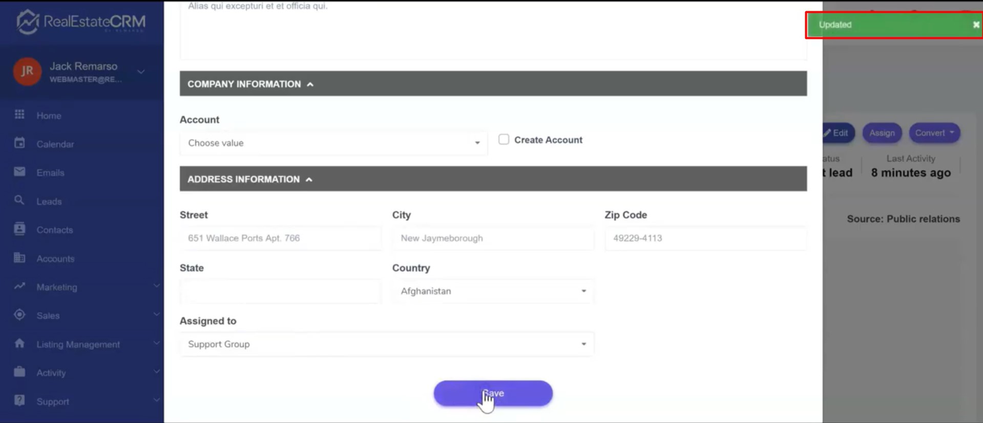 4. Click on the Save button once you’re done selecting the Assigned to value. A notification will pop up on the upper right of the page indicating that the update was successful.