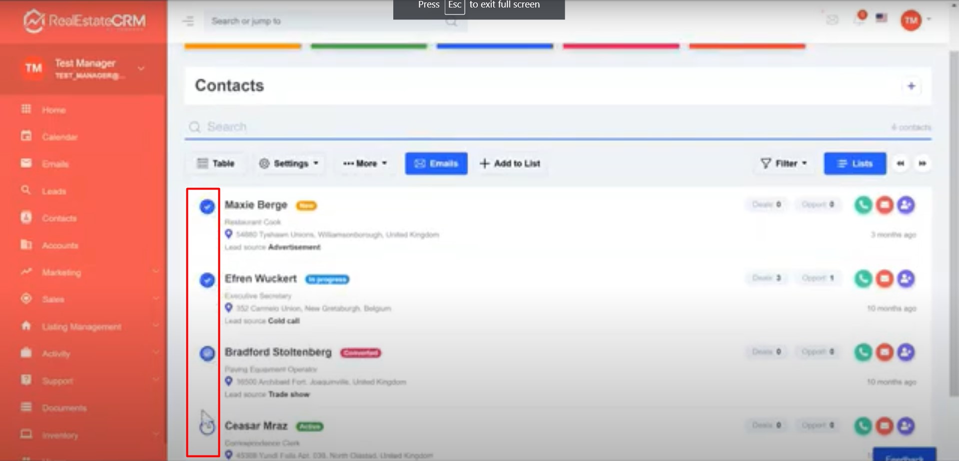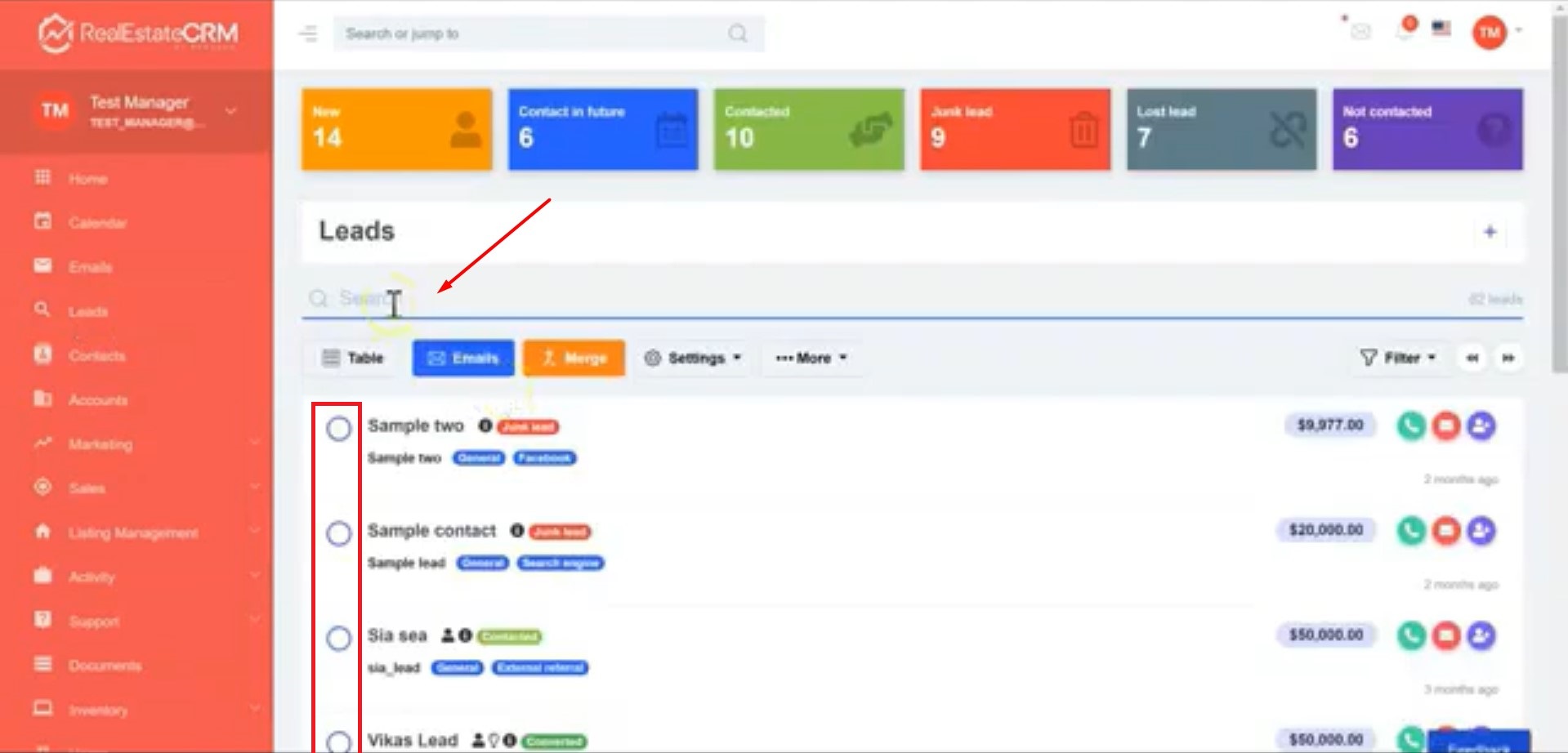 2. You can either search for the name, tags or simply put a check on the leads that you want to send the email to.