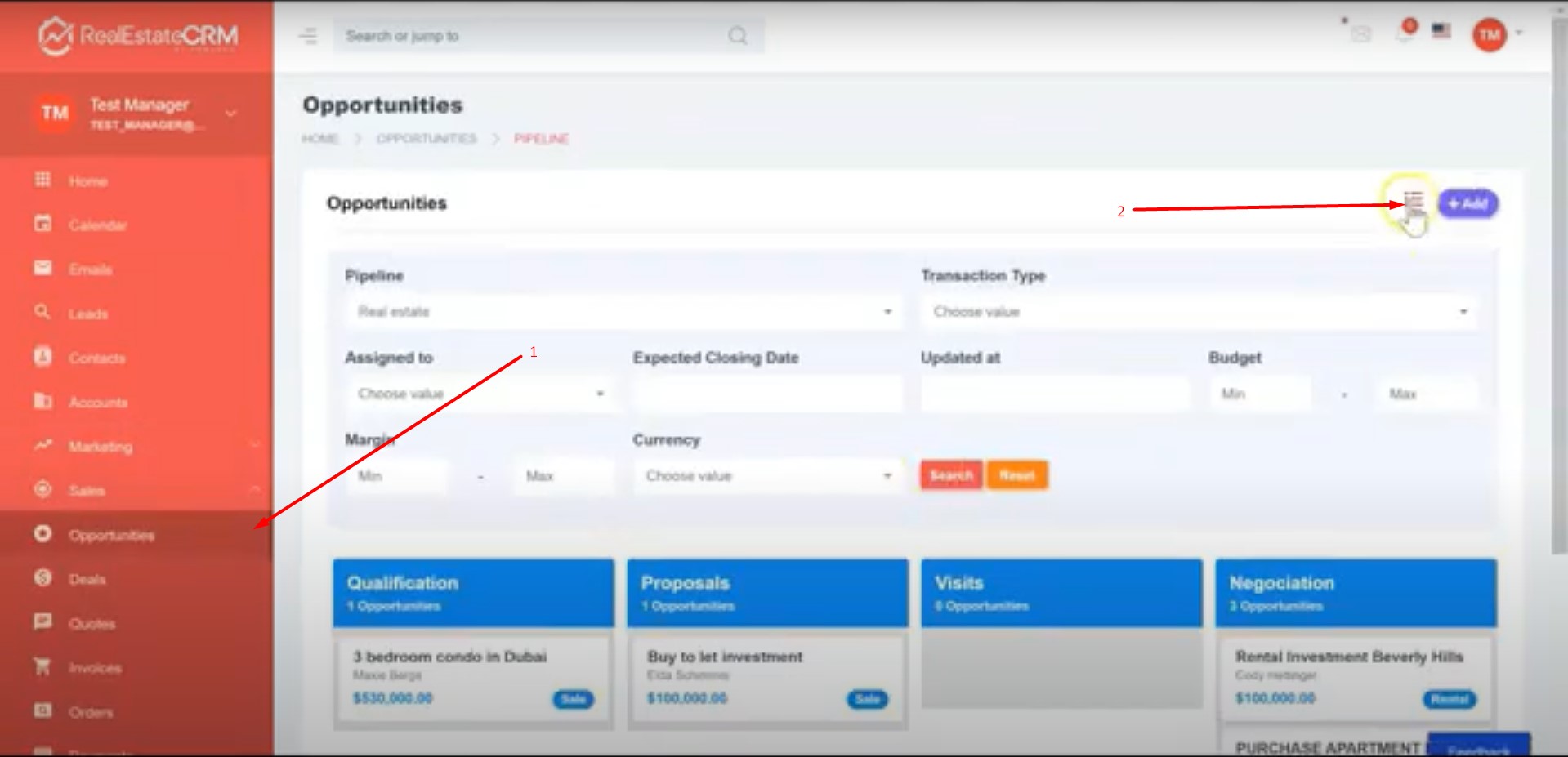 1. Click on Sales > Opportunities located on the left side of your dashboard then click on the list icon indicated by the screenshot below.