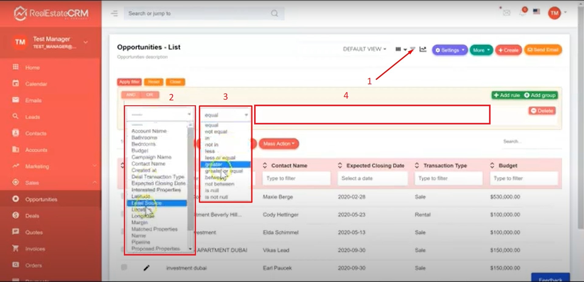 1. On the Opportunities List, click on the filter icon indicated in the screenshot below. A new drop-down list will pop up where you can select a value to filter out the list. You can also type in a value in the textbox indicated by number 4 on the screenshot below.