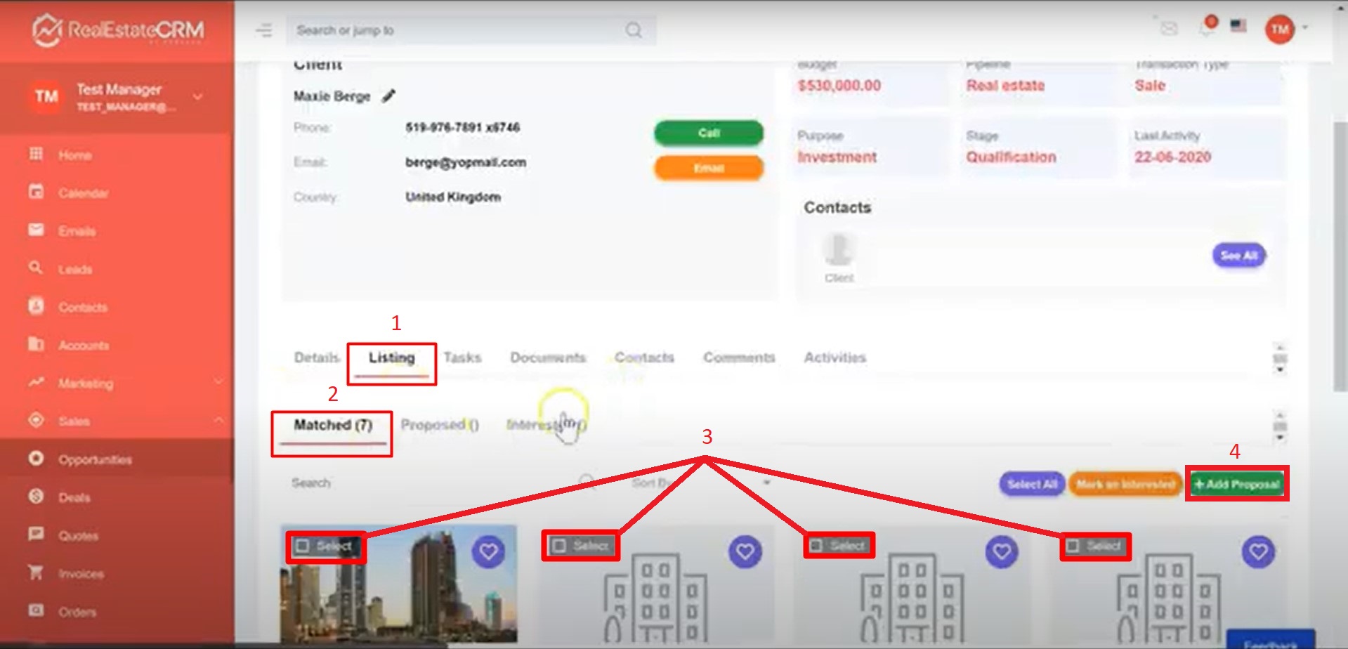 2. Click on Listing > Matched. You can then select which of the listing you wish to add to the proposal by putting a checkmark on the checkboxes indicated on the screenshot below then click on Add Proposal.