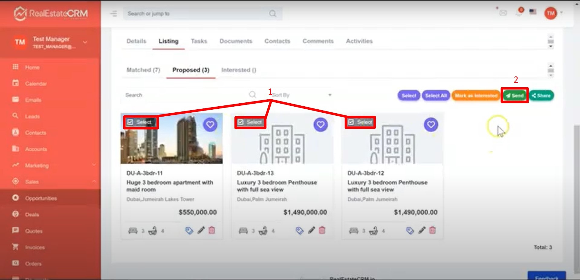 3. Click on the Proposed tab and select which of the listings you want to add to the email by putting a check on the checkboxes shown on the screenshot below then click on Send.