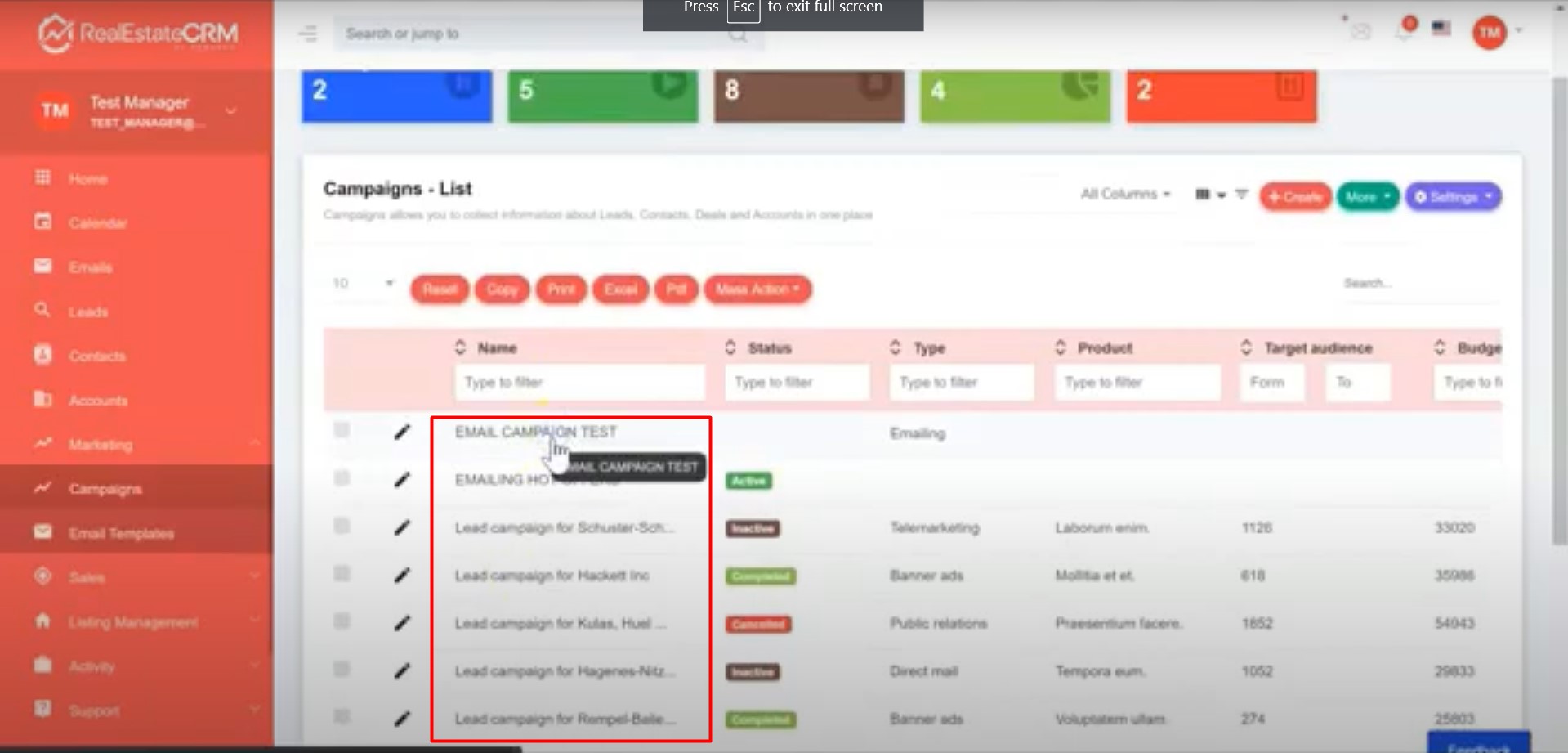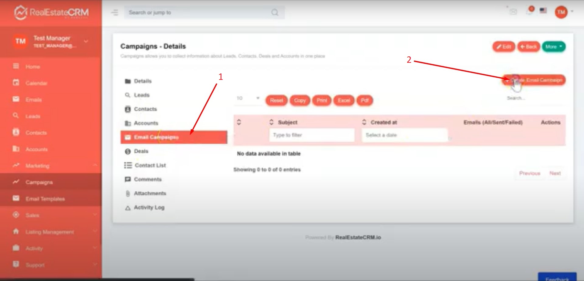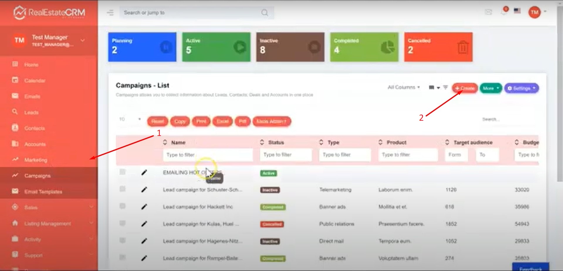 1. Click on Marketing > Campaigns located on the right side of your dashboard and click on Create.