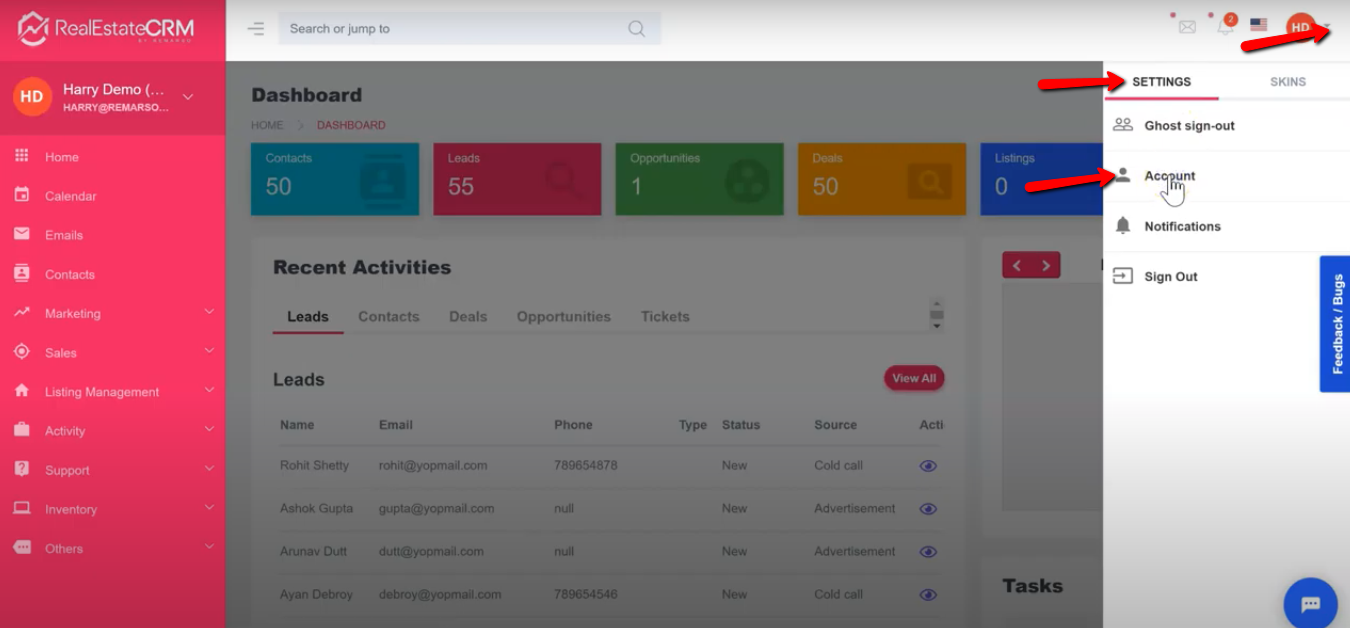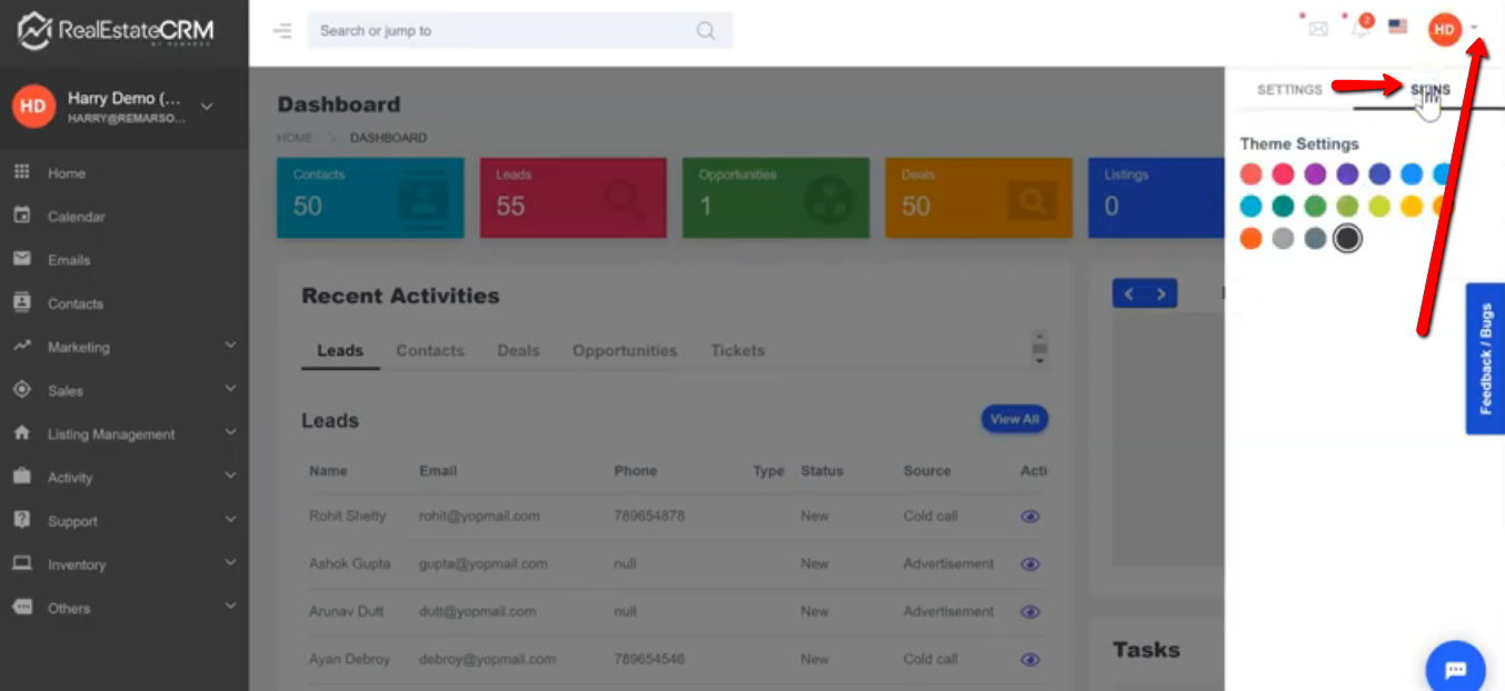 1. After logging in to RealEstateCRM.io you have an option to customize your account by changing the theme colors. Just click the dropdown beside your profile on the top-right part of the dashboard and click the “Skin” tab then select the color you prefer.