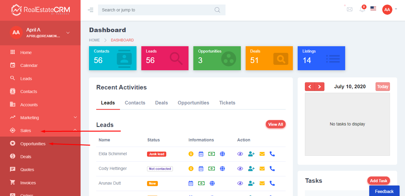 1. After logging in to app.realestatecrm.io, click the “Sales” section on the left sidebar of the page then click “Opportunities” from the dropdown. You’ll then be directed to the “Opportunities” page.