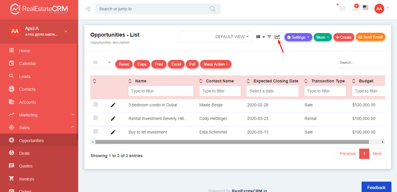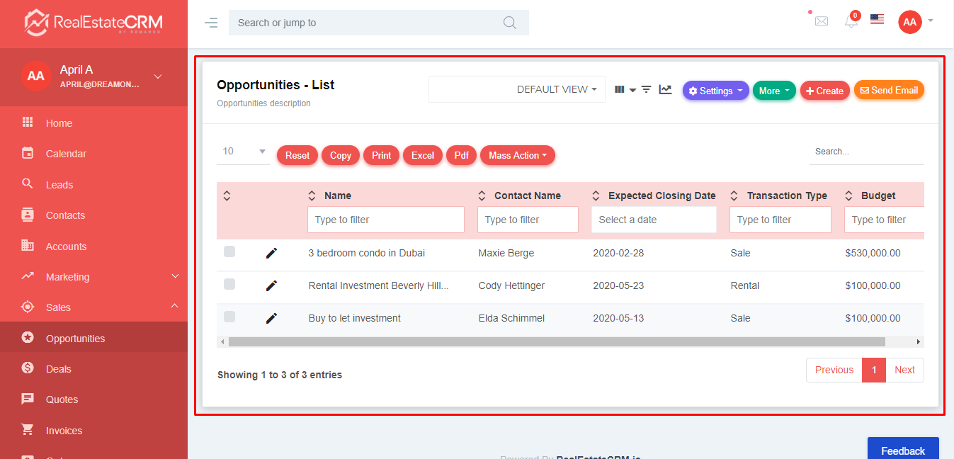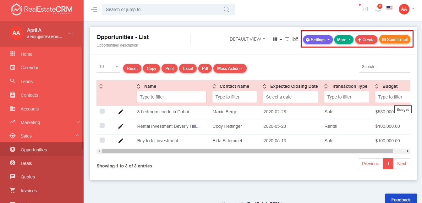 3. If you want to change your current opportunities settings, you can click the “Settings” button from the top-right part of the page. You can also click “More” to conduct quick create and import the opportunities. To create opportunities, click the “+Create” button, and to send an email click the “Send Email” button.