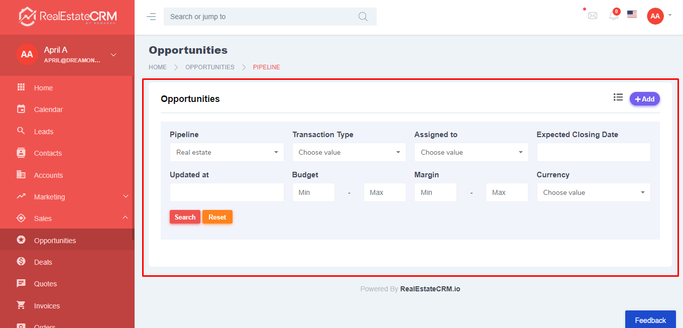 2. In the Pipeline view, you can either search for an opportunity by filling up the form and clicking the “Search” button or add a new opportunity by clicking the “+Add” button and filling out the form from the pop up.