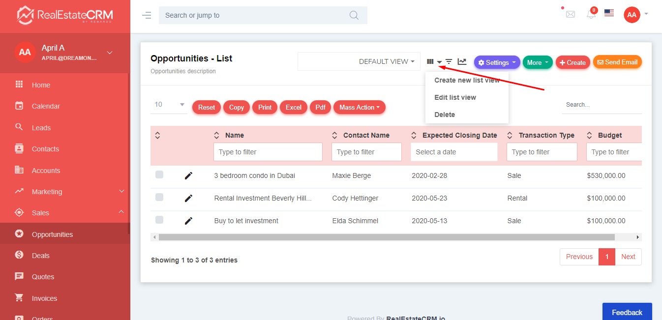 3. Going back to the “Opportunities” page, you can also change or edit the DEFAULT VIEW by clicking the “List View Settings” icon beside the DEFAULT VIEW dropdown. You can either “Create a new list view”, “Edit list view”, or “Delete”.