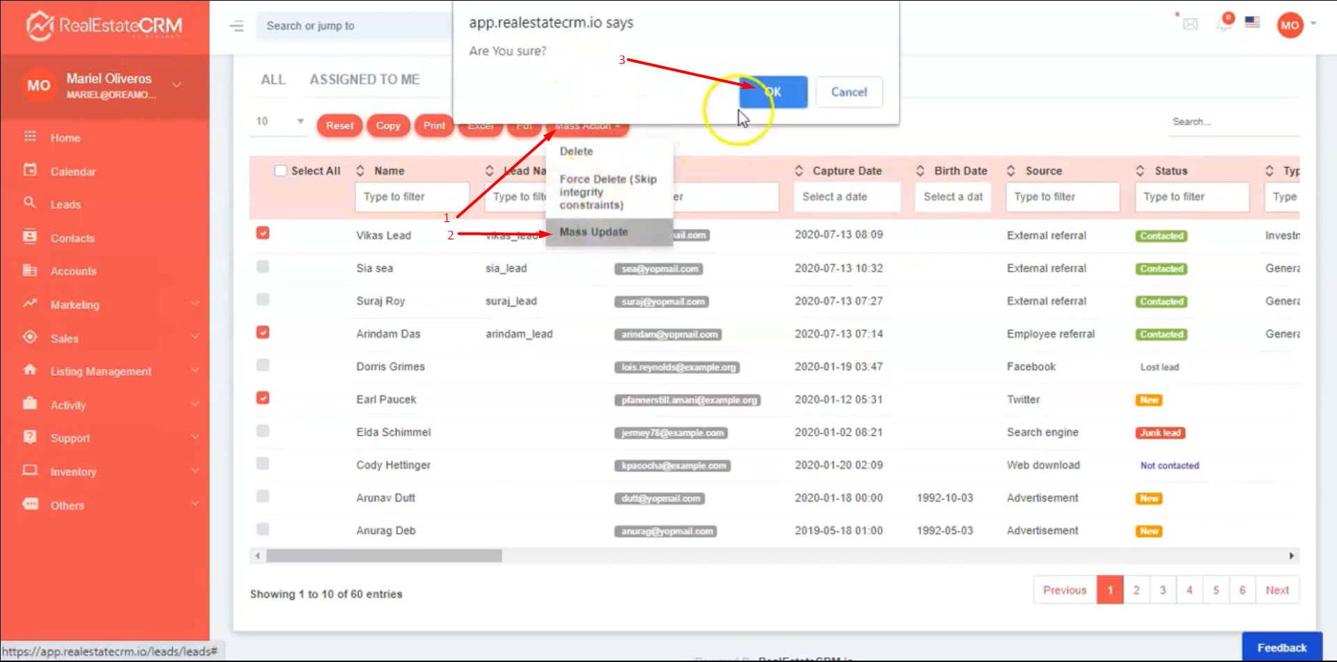 2. Select the context in which you would like to perform a mass update. You can do this by filtering using Name, Lead Name, Email, Capture Date, Source, Status, etc., or simply selecting your Leads by clicking on the check box.