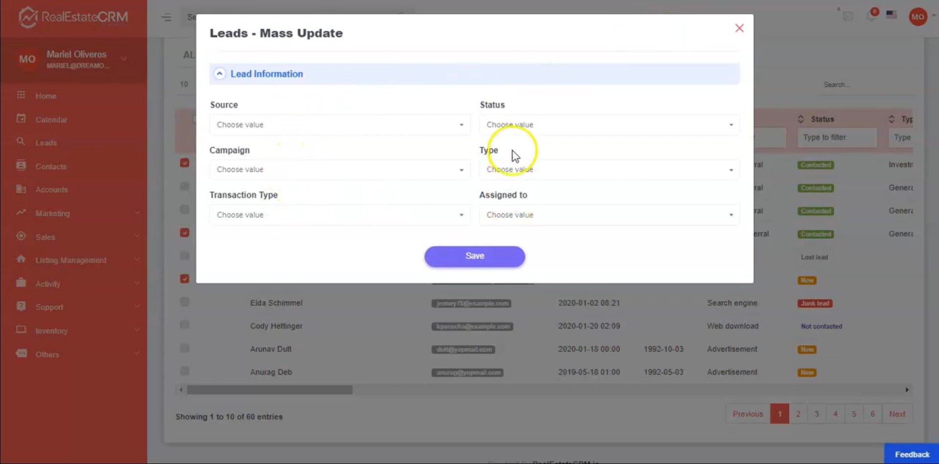 4. You can continue and make changes to these fields and it will apply to all of the Leads that were selected.